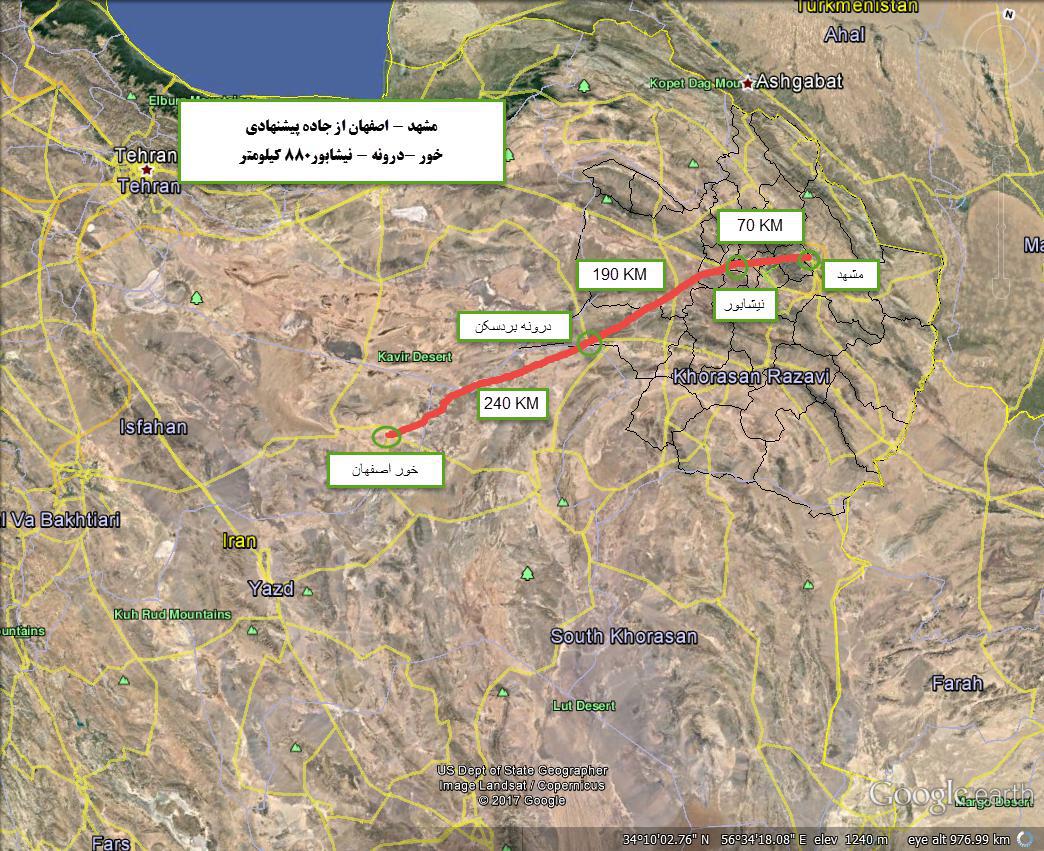 نقشه مسیر پیشنهادی اصفهان - مشهد از طریق اصفهان - نایین - خور - بردسکن - نیشابور - مشهد به حدود 880 کیلومتر که نزدیک ترین راه می باشد.این راه نسبت به مسیر 1200 کیلومتری فعلی حدود 320 کیلومتر نزدیکتر بوده و از نظر حفظ سرمایه ملی یعنی وقت و سوخت بسیار به صرفه است و دو قطب بزرگ صنعتی و جمعیتی کشور یعنی اصفهان و مشهد را بسیار به هم نزدیک می کند.