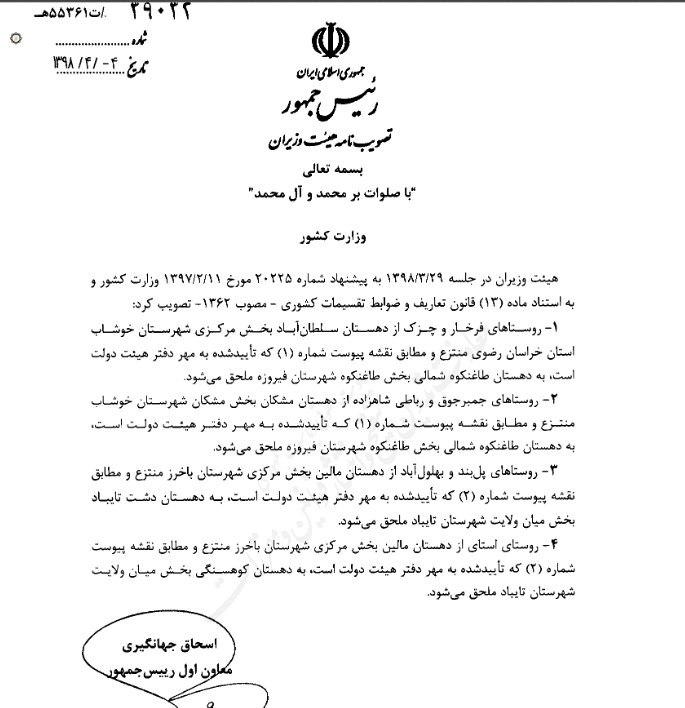 بالاخره پس از 9 سال روستاهای چزگ ، فرخار ، جمبرجوق و رباطی شاهزاده که جهت انجام ارتقای بخش خوشاب سبزوار به شهرستان در سال 1389 با تخلف مدیران استانداری وقت از شهرستان فیروزه جدا شده بودند ، به دامان فیروزه نیشابوری برگشتند. دولت این امر را در جلسه 29 خرداد 98 مصوب نمود و 4 تیرماه 98 این مصوبه با امضای معاون اول ریاست جمهوری ابلاغ و منتشر شد. از همه عزیزانی که پیگیر این امر بودند ، سپاسگزاریم.